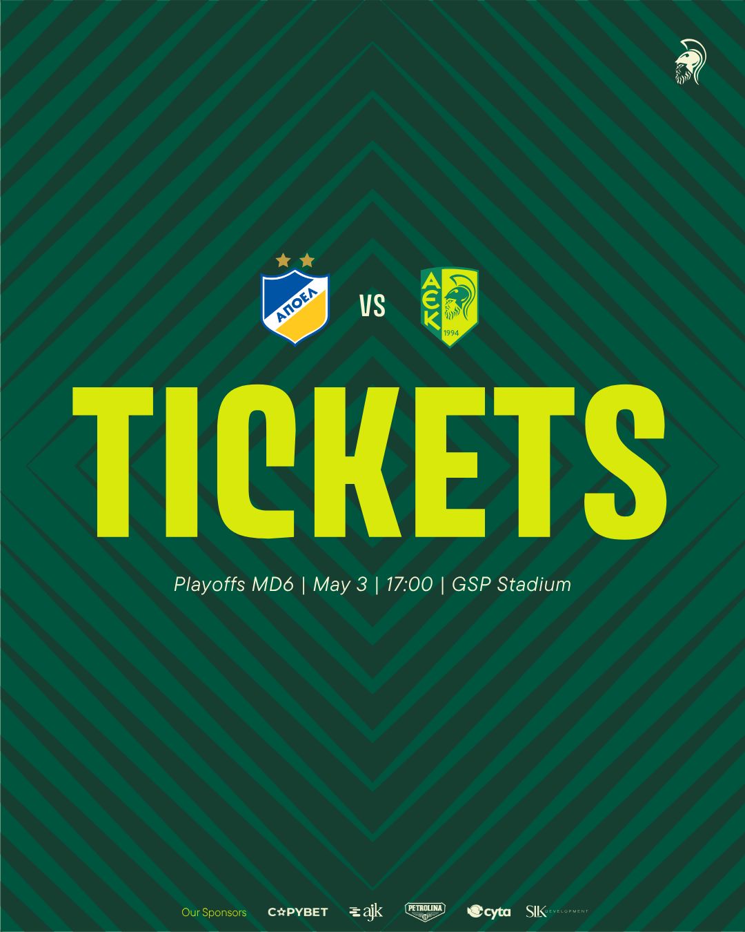 Η ΑΕΚ LARNACA FC LTD ενημερώνει το φίλαθλο κοινό για τις λεπτομέρειες της προπώλησης εισιτηρίων του αγώνα της 6ης αγωνιστικής της Β' Φάσης του πρωταθλήματος με αντίπαλο το ΑΠΟΕΛ, ο οποίος θα διεξαχθεί την Κυριακή (03/05) στις 17:00 στο ΓΣΠ.
