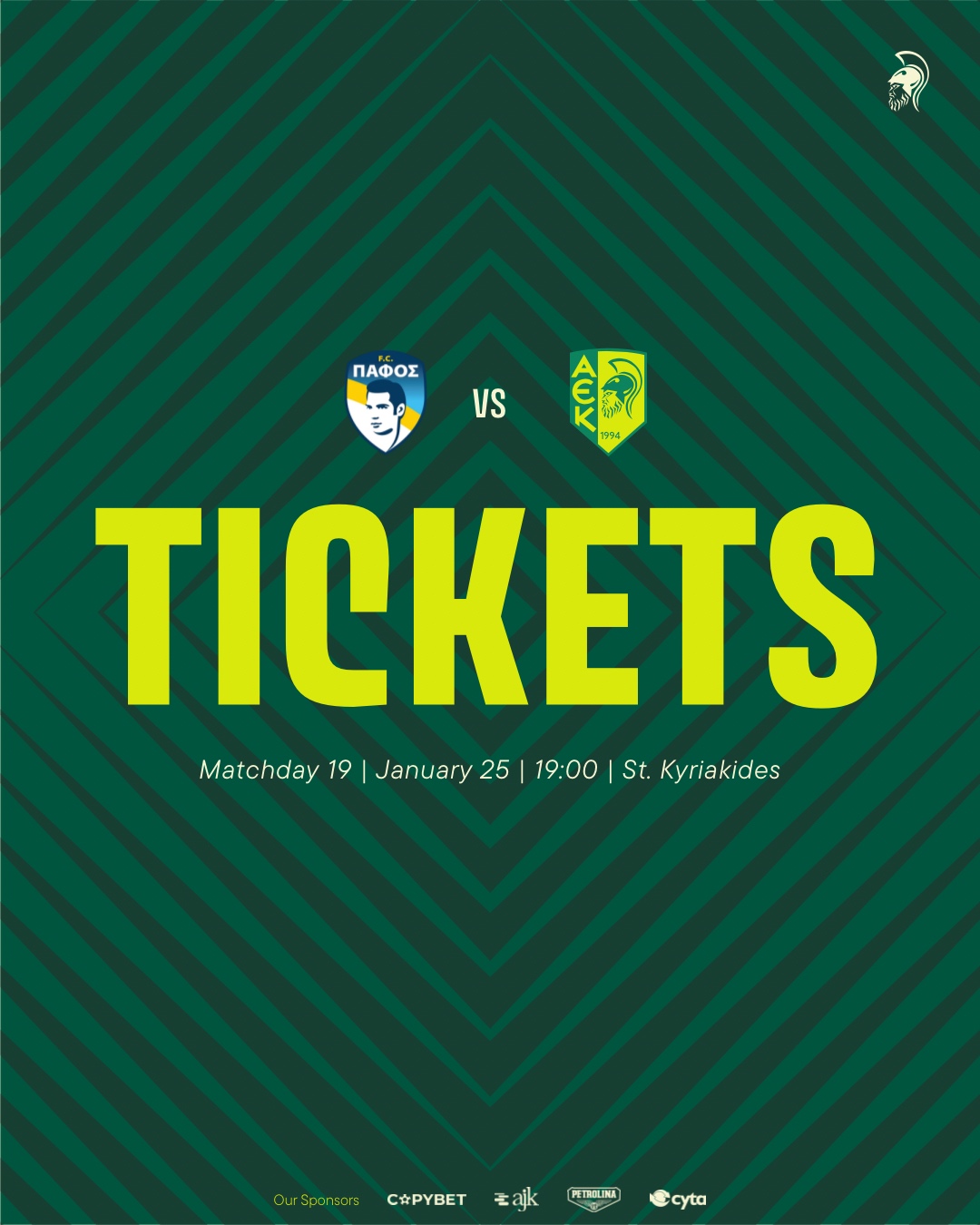 Η προπώληση θα ξεκινήσει αύριο Τρίτη (20/01) ηλεκτρονικά και από το AEK Store. 👉[Πατήστε EΔΩ για ηλεκτρονικές αγορές εισιτηρίων].