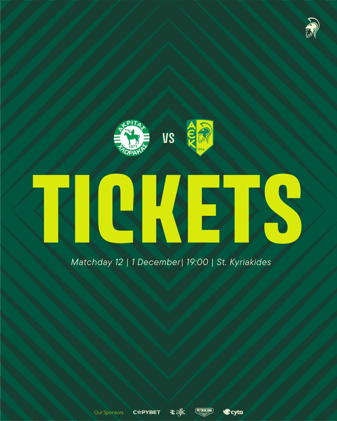 Η ΑΕΚ LARNACA FC LTD ενημερώνει το φίλαθλο κοινό για τις λεπτομέρειες της προπώλησης εισιτηρίων του αγώνα της 12ης αγωνιστικής του πρωταθλήματος με αντίπαλο τον Aκρίτα Χλώρακας, ο οποίος θα διεξαχθεί την Δευτέρα (01/12, 19:00) στο Στάδιο "Στέλιος Κυριακίδη.
