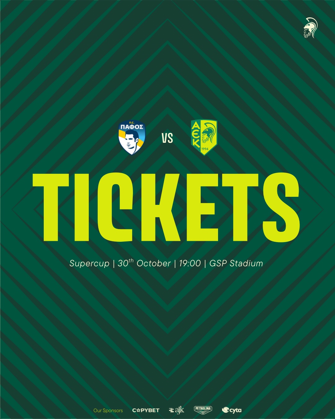 Η ΑΕΚ LARNACA FC LTD ενημερώνει το φίλαθλο κοινό για τις λεπτομέρειες της προπώλησης εισιτηρίων του αγώνα του Super Cup με αντίπαλο την Πάφος FC, ο οποίος θα διεξαχθεί την Πέμπτη (30/10) στις 19:00 στο ΓΣΠ.