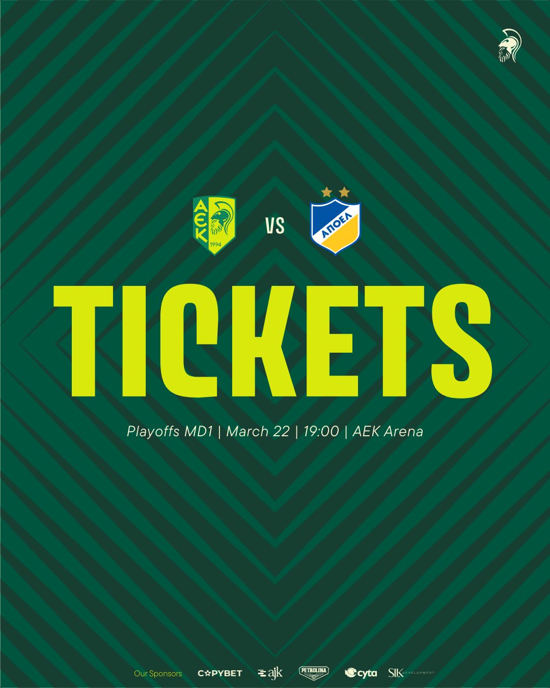 H ΑΕΚ LARNACA FC LTD ενημερώνει το φίλαθλο κοινό για τις λεπτομέρειες της διάθεσης πακέτων εισιτηρίων για τα πέντε εντός έδρας παιχνίδια της Β' Φάσης του πρωταθλήματος, καθώς και της προπώλησης μεμονωμένων εισιτηρίων του αγώνα της 1ης αγωνιστικής της 2ης φάσης του πρωταθλήματος με αντίπαλο το ΑΠΟΕΛ, ο οποίος θα διεξαχθεί την Κυριακή (22/03, 19:00) στο AEK ARENA.