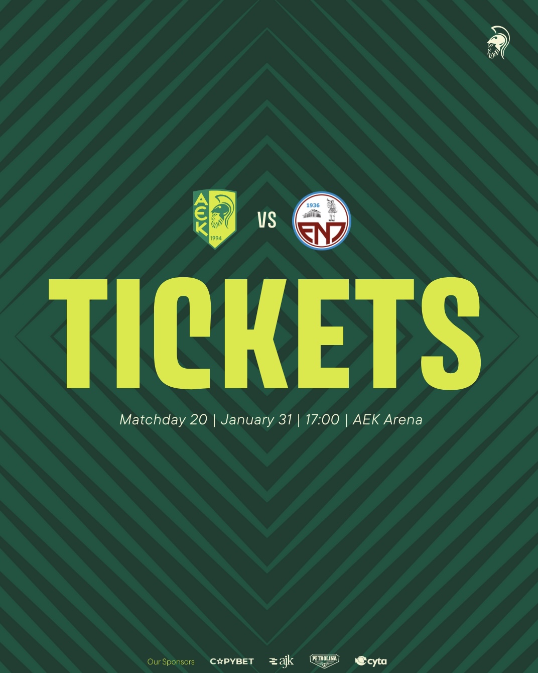 Η προπώληση εισιτηρίων ξεκίνησε σήμερα ηλεκτρονικά και αύριο (29/01) από το AEK Store.👉 [Πατήστε EΔΩ για ηλεκτρονικές αγορές εισιτηρίων].