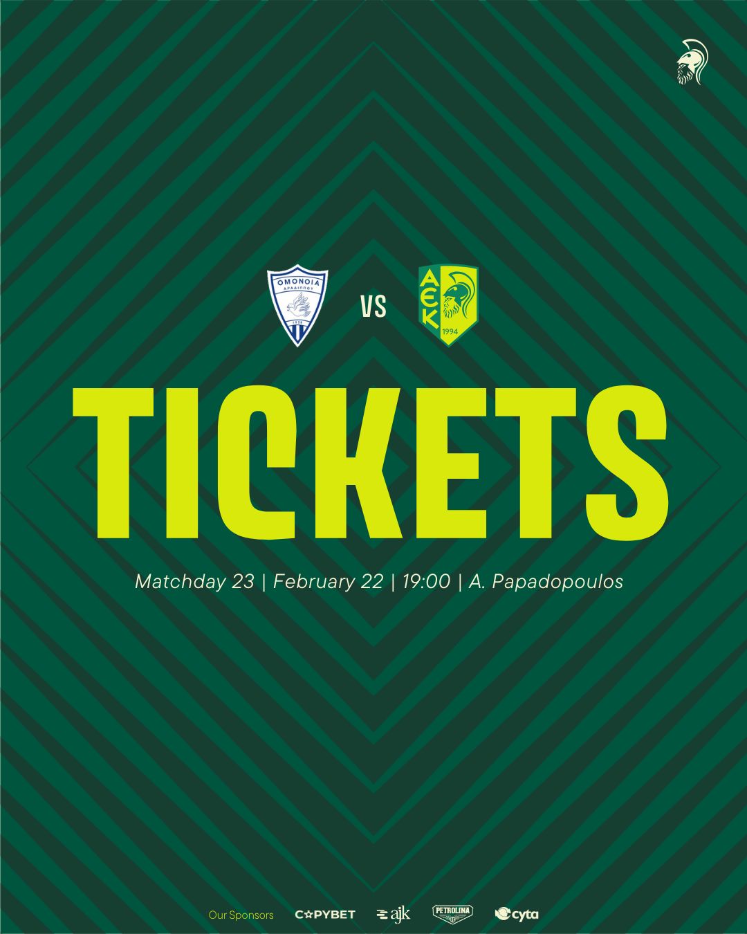 Η ΑΕΚ LARNACA FC LTD ενημερώνει το φίλαθλο κοινό για τις λεπτομέρειες της προπώλησης εισιτηρίων του αγώνα της 23ης αγωνιστικής του πρωταθλήματος, με αντίπαλο την Ομόνοια Αραδίππου στο «Αντώνης Παπαδόπουλος», που θα διεξαχθεί την Κυριακή 22/02, στις 19:00.